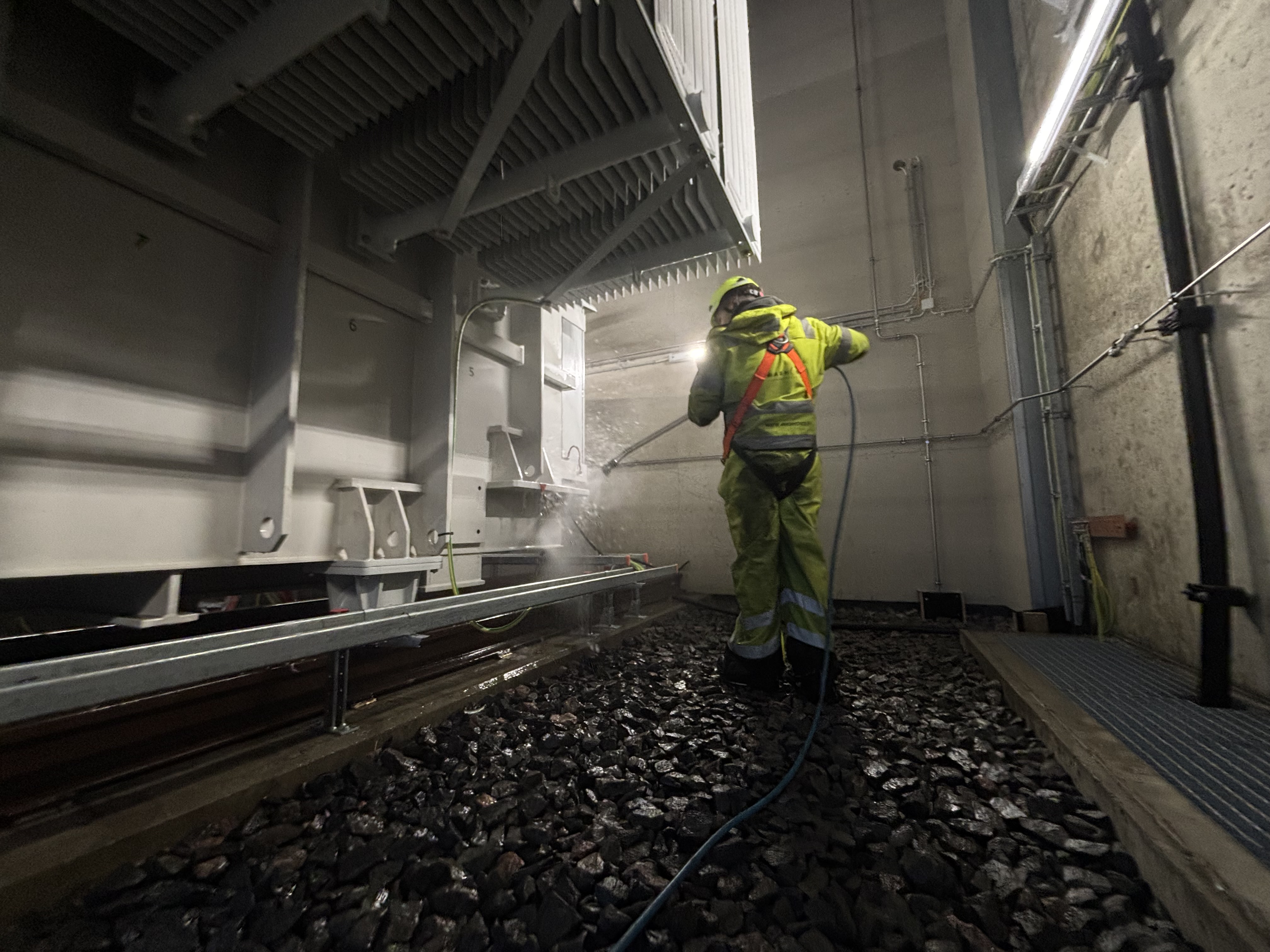 Esimerkiksi muuntajat, pumppaamot, tekniset tilat, kaapelihyllyt ja muut herkät kohteet pestään matalapaineella ja hallitusti.